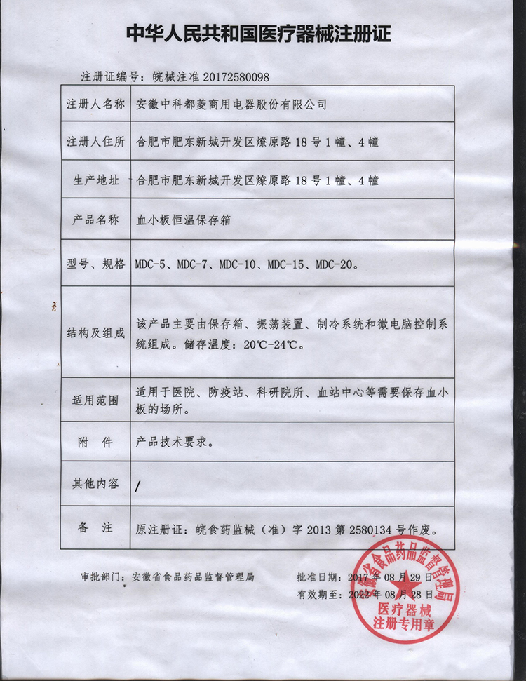 血小板恒温保存箱注册证